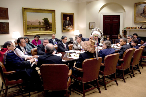 White House meeting with Obama, photo 2010: Earl J. Barbry, Sr., Chairman, Tunica-Biloxi Tribe of Louisiana; Cedric Black Eagle, Chairman, Crow Nation; Brian Cladoosby, Chairman, Swinomish Indian Tribal Community; Karen Diver, Chairwoman, Fond du Lac Band of Lake Superior Chippewa; Brenda Edwards, Chairperson, Caddo Nation; Tex G. Hall, Chairman, Mandan, Hidatsa, and Arikara Nation: Three Affiliated Tribes; Gary Hayes, Chairman, Ute Mountain Ute Tribe; John Red Eagle, Principal Chief, Osage Nation; Joe Shirley, Jr. , President, Navajo Nation; Robert H. Smith, Chairman, Pala Band of Mission Indians; Edward K. Thomas, President, Tlingit Haida Central Council; Mervin Wright, Jr., Chairman, Pyramid Lake Paiute Tribe of Nevada